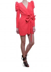 Rochie scurta cu umeri bufanti, inchidere pe spate cu fermoar, petrecuta in partea de jos, cordon cu funda detasabila. Material Poliester 89% , Spandex 11%. Modelul din imagine poarta marimea S, avand 1.75m inaltime si 50kg.
